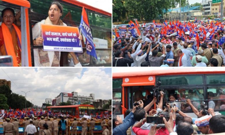 इस दौरान प्रदर्शनकारी महिलाएं हर महिला को सुरक्षा और आजादी दो, सम्मानजनक रोजगार दो, केजी से पीजी तक महिलाओं की शिक्षा निशुल्क करो, रोजमर्रा की वस्तुओं की महंगाई पर रोक लगाओ आदि के नारे लगा रही थी। इस दौरान जुलूस जैसे ही विधान भवन की तरफ आगे बढ़ा, वहां पहले से मौजूद पुलिस प्रशासन ने रोक दिया।इस दौरान प्रदर्शनकारी महिलाओं की पुलिस से तीखी नोकझोंक और झड़प भी हुईं। जिसके बाद पुलिस ने प्रदर्शनकारी महिलाओं को हिरासत में लेकर बसों में लादकर इको गार्डन भिजवा दिया।
