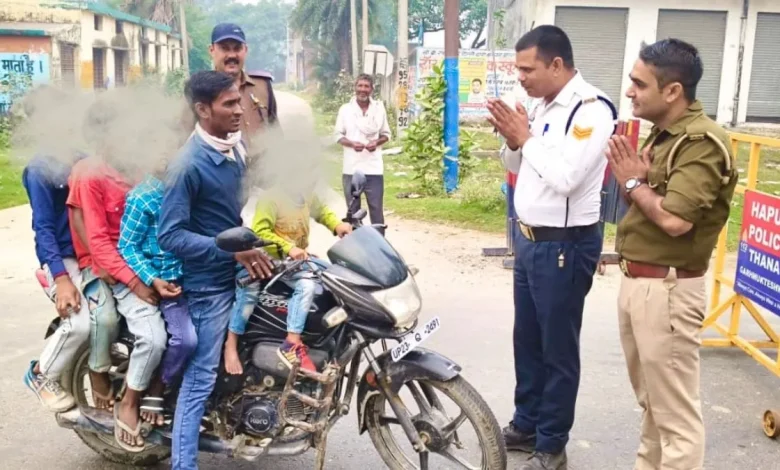 बता दें कि गढ़मुक्तेश्वर क्षेत्र में एक चेक पोस्ट पर पुलिसकर्मियों ने 4 नवंबर को दोपहर करीब साढ़े 11 बजे एक बाइक पर सवार 7 लोगों को रोका. बाइक रुकने पर पुलिसकर्मियों ने देखा कि उसपर करीब 3 साल से लेकर 10 साल तक की उम्र के बच्चों के साथ बाइक सवार शख्स सहित कुल 7 लोग सवार हैं. 7 लोगों को देखते ही पुलिसकर्मी हैरत में पड़ गए. शख्स छोटे-छोटे बच्चों के साथ बिना हेलमेट लगाए अपनी और मासूम बच्चों की जिंदगी को खतरे में डालकर सड़क पर सफर कर रहा था. बाइक सवार ने 2 बच्चों को बाइक की पेट्रोल टंकी के ऊपर और अन्य को बाइक की सीट से लेकर पीछे वाली लाइट तक बैठाया हुआ था.